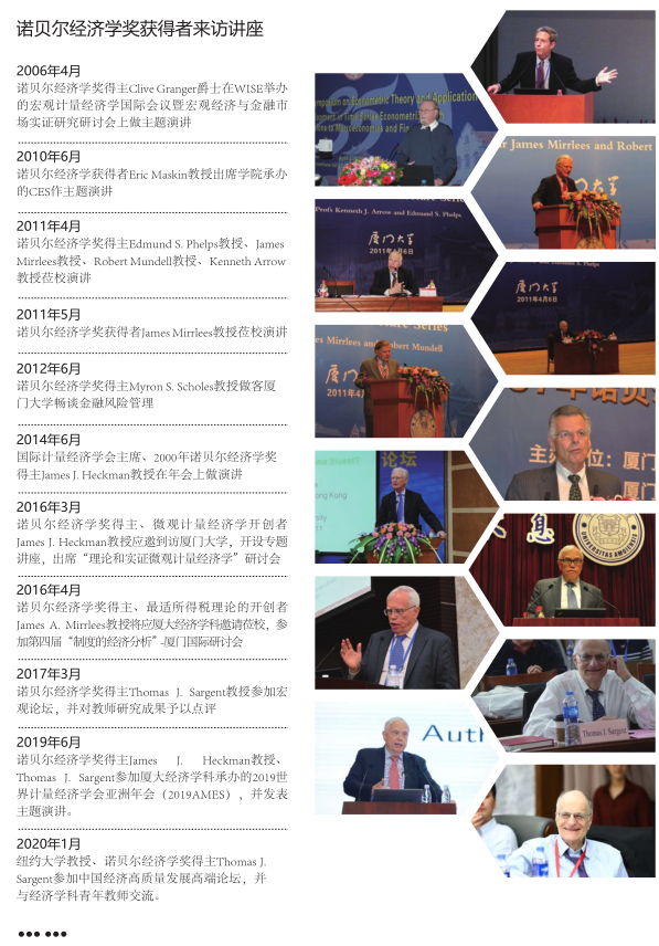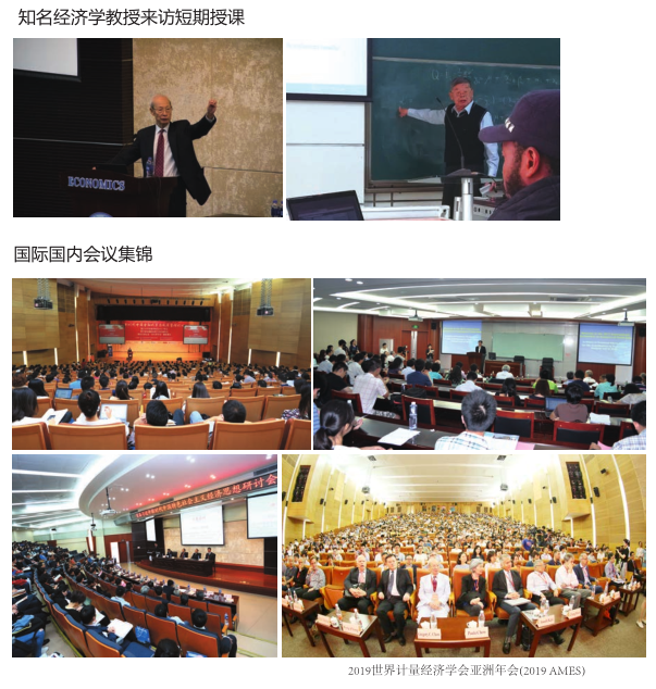 厦门大学经济学科实施“学术品牌战略”,积极开拓和发展对外学术交流与合作,有着浓厚的学术氛围,利用各种条件从海内外各高校和机构邀请经济学家与业界精英定期举办各类学术活动,共主办了百余场国际、国内学术会议,邀请包括诺贝尔经济学奖获得者、克拉克奖获得者在内的国际顶尖经济学家参会,举办系列学术讲座(Seminar)千余场 。此外,还邀请国际知名教授来访进行短期授课。给师生创造机会接触最前沿的现代经济学研究课题及发展趋势,与海外学者面对面,享受世界顶尖水平的学术大餐,培养研究生的国际视野,提高国际合作与竞争能力。